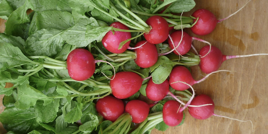 1 Bund Radieschen entfernen und die Radieschen gründlich abwaschen.