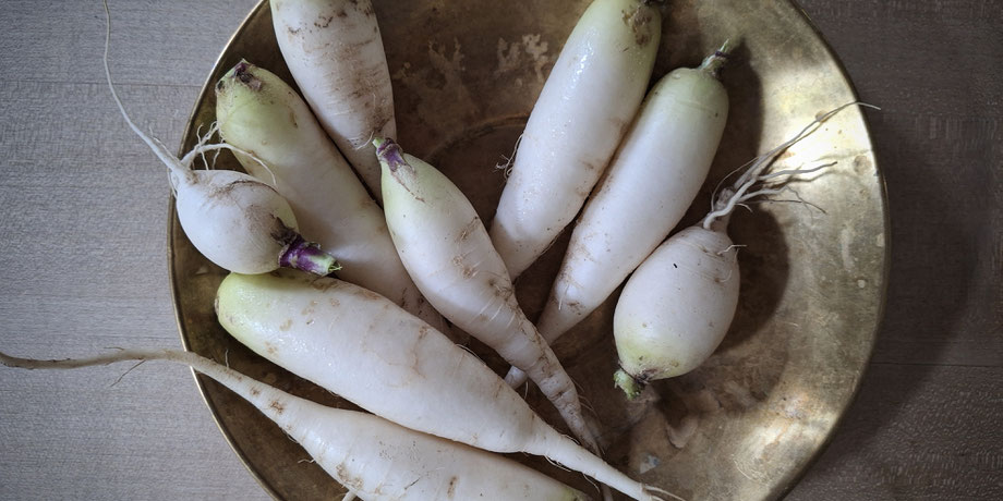 1 Rettich schälen und in ganz dünne Scheiben schneiden oder reiben. Mit