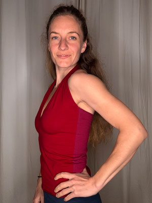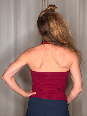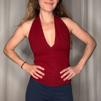 Das NeckholderTop hat keine Taillierung, was aber durch die Wasserfallwirkung des Rückenteils ausgeglichen wird. Den besonderen Reiz bekommt das Top durch das Band im Nacken, welches dem Vorderteil eine schmückende Mittelnaht beschert. Das Oberteil ist auch zweifarbig erhältlich (hinten andere Farbe als vorne), wodurch es einen WestenCharakter bekommt.